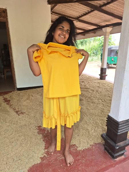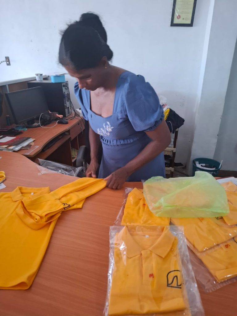 In december kwam Erna op het idee alle sponsorkinderen een nieuw t-shirt te geven. De reden was dat bijna alle kinderen shirtjes met gaten aan hadden, dus dat was een goed idee voor de eerste helft van het jaar. Senpathi nam ons mee naar het bedrijfje dat voor ons in 2012 polo-shirts voor het schoolmeubelreparatieproject had gemaakt. Toen kregen de leerlingen en betrokkenen die daar aan mee deden een polo-shirt. De eigenaar van de zaak wist nog precies hoe het toen gegaan was. Toen kon hij een shirt regelen voor 950 rupees; maar nu kan hij zo’n shirt niet meer leveren voor minder dan 2500 rupees! Omdat het nu gaat over leerlingen van 6 tot 19 jaar, is het anders met de maten. Dat gaf even verwarring, gelukkig werd dit snel aangepast, voor alle sponsorkinderen is er een passende maat. Op het shirt staat de olifant met het kind voor en achterop. De naam Sri Lanka Support wordt niet vermeld. Met deze zonnige kleur geel zien de kinderen er pico-bello uit!