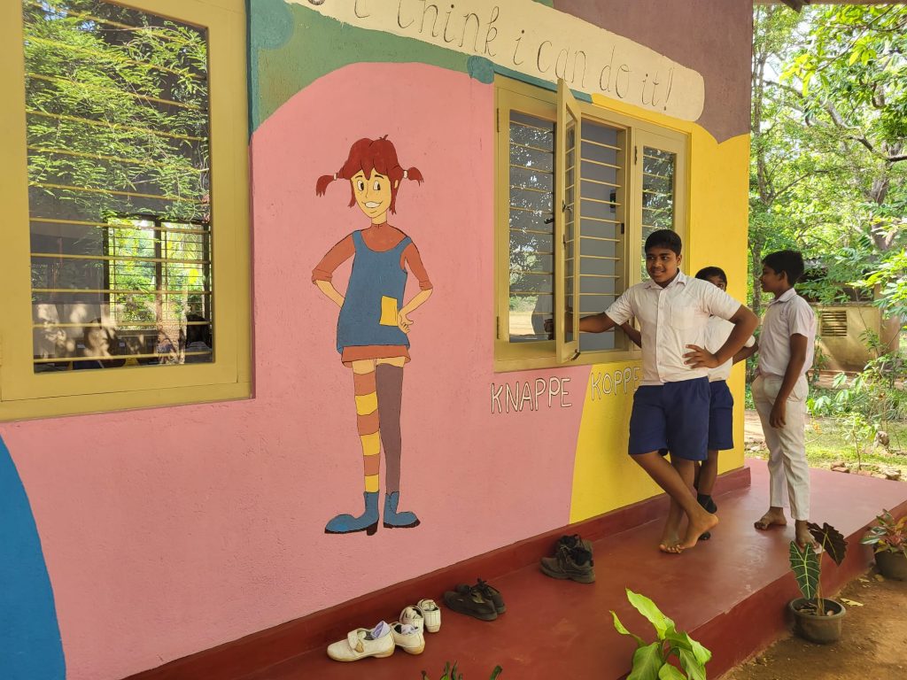 Heel onverwachts kregen we begin april contact met de organisatie ‘Knappe Koppen’. Zes studenten zochten vervanging voor hun geannuleerde werkreis naar Congo. Omdat de grootvader van een van hen een paar keer bij Janny op Sri Lanka is geweest, kwam dit contact snel tot stand. Binnen een paar dagen was door de Knappe Koppen-manager alles geregeld: deze werkreis ging door! Bij de Suchirithagama School werd met Knappe Koppen geld een prachtig lokaal afgebouwd; vooral de mooie kleuren maakten veel indruk op de Sri Lankaanse leerlingen. Op de gevel kwam Pippi Langkous/Longstocking en haar aapje. Op 24 juni was de feestelijke opening, waarbij de staf, de ouders en alle leerlingen werden betrokken. In de speeches werden de zes ‘Knappe Koppen’ heel hartelijk bedankt en ook Senpathi Weerage, de mason, de carpenter en de painters kregen veel waardering. Óp naar de toekomst voor de Suchirithagama leerlingen!