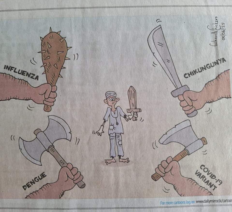 De ziekten Influenza, Dengue, COVID-19 Variant, Chikungunya bedreigen momenteel Sri Lanka. Vooral in de grote steden zi t de angst er goed in. Voor alles is een groot tekort aan medicijnen. Veel mensen gaan uit voorzorg mondkapjes dragen. De overheid roept op om er voor te zorgen dat er geen waterplassen staan, omdat daar de muggen (die meestal de oorzaak zijn) graag broeden. Vooral bij de scholen is daar veel aandacht voor. De Epidemiology Unit, Ministry of Health (MOH), verklaart dat de National Dengue Control Unit (NDCU) vanaf begin 2023 36.628 dengue besmettingen heeft gerapporteerd. Er is geen malaria meer op Sri Lanka. In Nederland kreeg Janny het advies zich te laten inenten tegen dengue, omdat daar nog geen medicijnen voor zijn. Dus direct na 11 juli krijgt ze haar eerste vaccinatie en vlak voor vertrek, 3 maanden later, nog een tweede. Voorkomen is immers beter dan genezen.